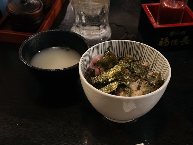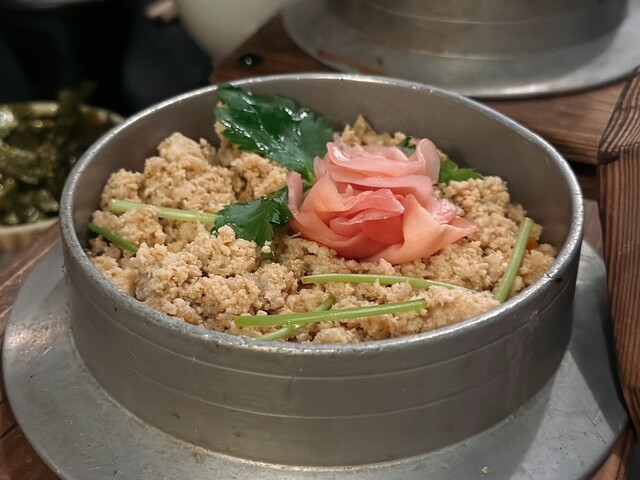 締めは鶏そぼろの入った炊き込みご飯。刻み海苔を添え、鶏スープとともに鶏の旨味を存分に味わって完食完飲。