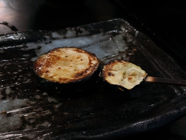 そして野菜が到着。一見するとナスだが実はズッキーニで食べると納得。瑞々しさの残る食感がいい感じ。からのせせり。程よい弾力の食感にコクのある甘味と旨味が味わえる。そして再び野菜からナスがエントリー。田楽風にアレンジしてあり、味噌の風味が旨い。