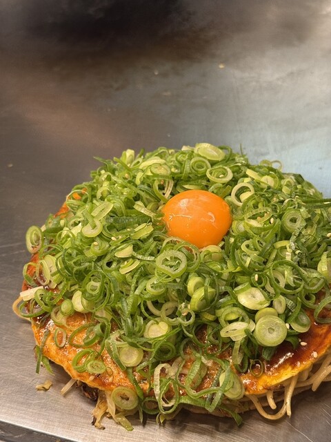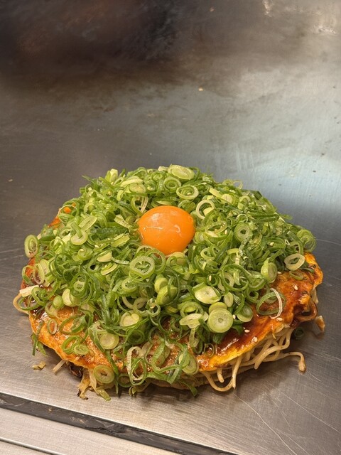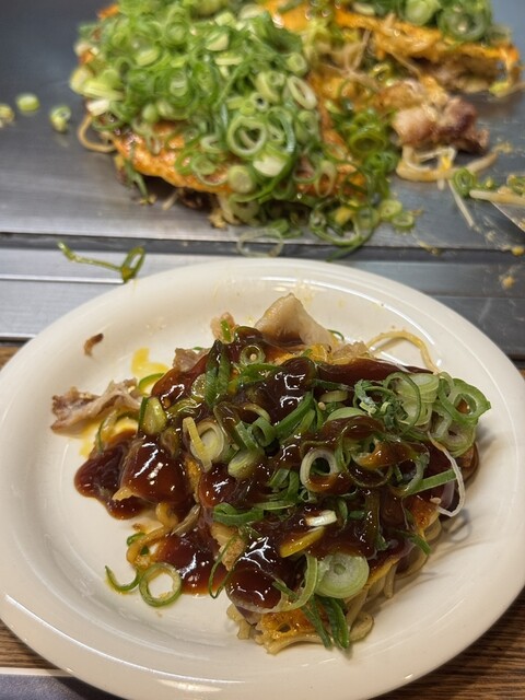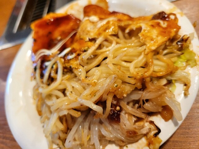 そばの量が多く、いい加減でカリッと焼き上がってる。メインの豚肉もしっかり入って、キャベツ・もやし・玉ねぎ、野菜もたっぷりでボリューミー。一番安いお好み焼きで、このクオリティに大満足。