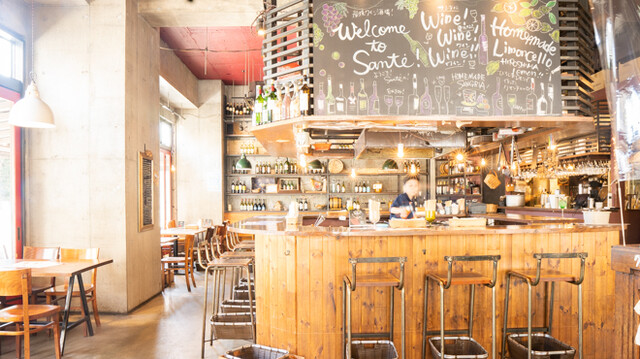 炭火焼きの料理や豊富なワインを楽しめる【Sante】。新鮮な豚モツを使用した名物の炭焼き豚料理は、部位に合わせて塩焼き・タレ焼きでご提供しております。「赤ワインもつ煮込」などの一品料理と好相性なワインは、約200種類ものラインナップ。併設するワインショップでのご購入も可能です♪店内には、焼き台を囲むカウンター席や、人数に応じてご利用いただけるテーブル席をご用意。開放感のあるテラス席も◎