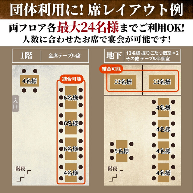 有 (2人可、4人可、6人可、8人可、10~20人可、20~30人可) 貸切:24人(それ以上の人数は応相談とさせていただきます) |
