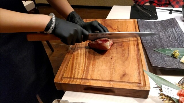 塊焼きは、七輪の上で焼いた後、店員さんが切ってもりつけてくれた。