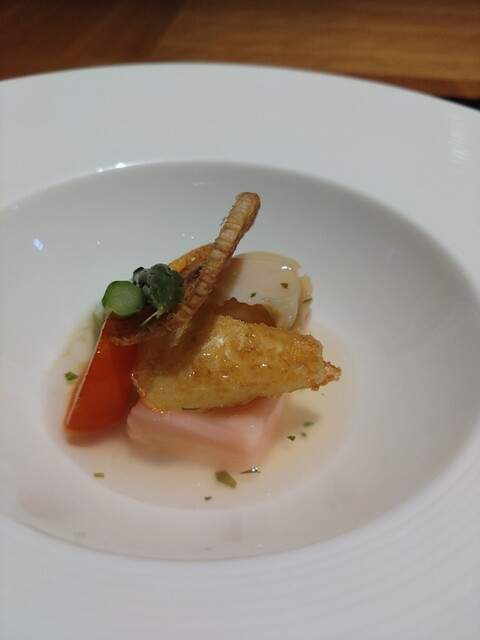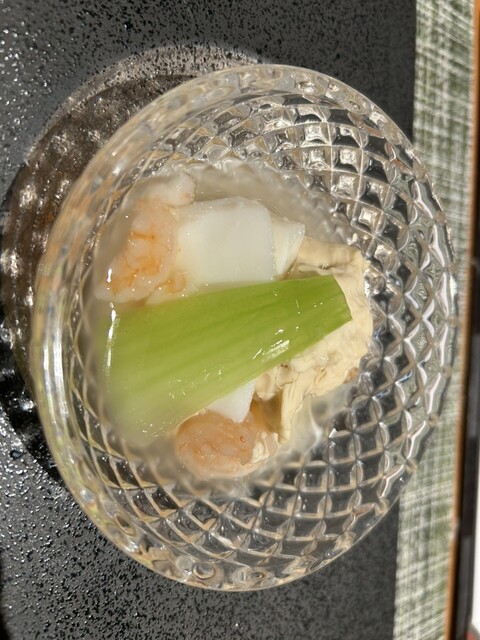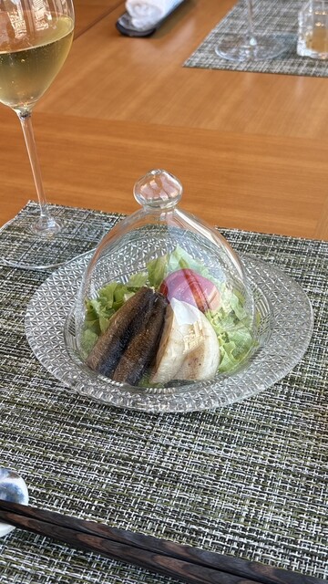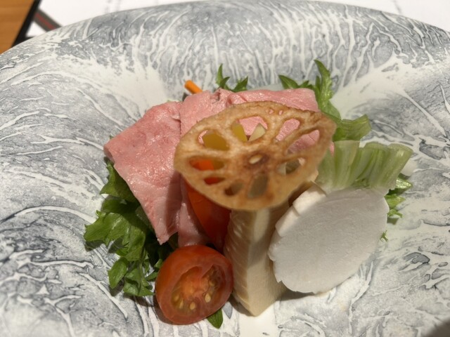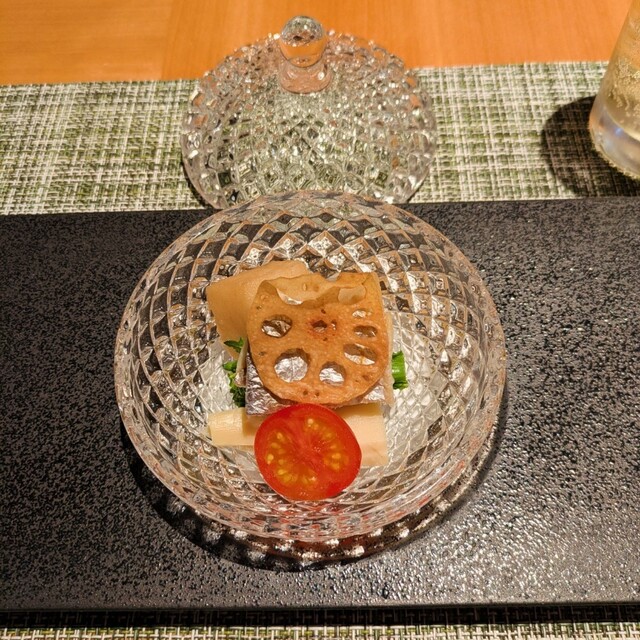 ランチで訪問。予約して伺い、小上がりのテーブル個室に案内いただく。メニューは今月のランチからおすすめ会席料理の四季彩御膳を予めお願いしており、まずは一の膳が到着しコーススタート。