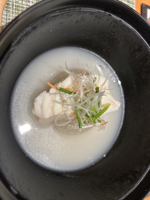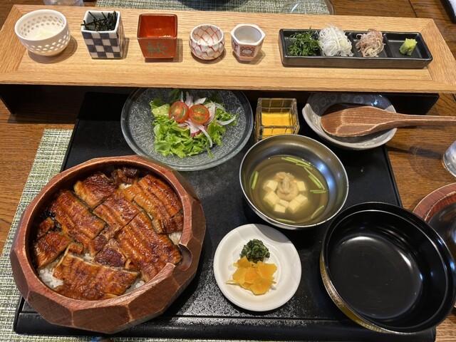 お造りはボタン海老とマグロのたたきの2種盛り。他は炙り穴子のサラダにごま豆腐と湯葉の小鉢、小鰯の南蛮漬け、寒鰤の照焼がセットになった豪華ラインナップ。とろりとした味わいのお造りに、しっとり...