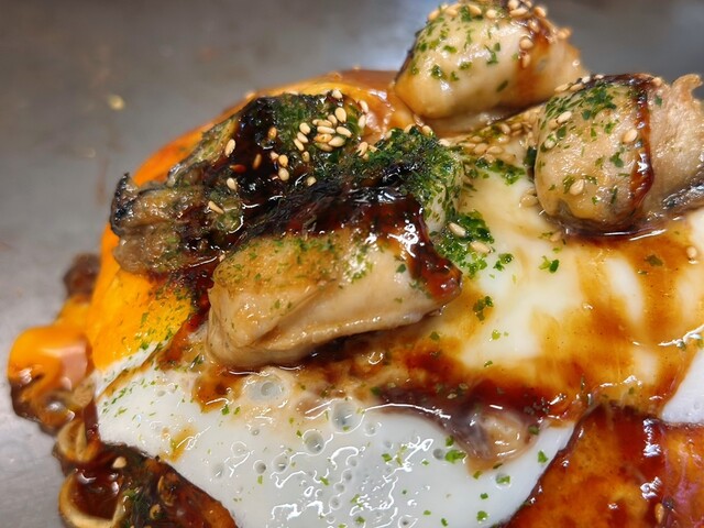宮島産大ぶり肉厚ブランドかきを大量投下。カキむちゃでか。お好み焼きも牡蠣も楽しめる。