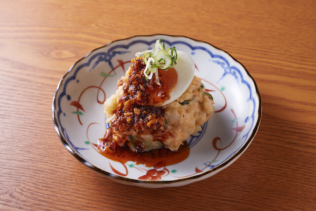 まずはポテサラが到着。ゆで卵が乗ってインパクトがあるとともに、食べるラー油がかかっておりパンチの効いたおいしさがビールに合う。