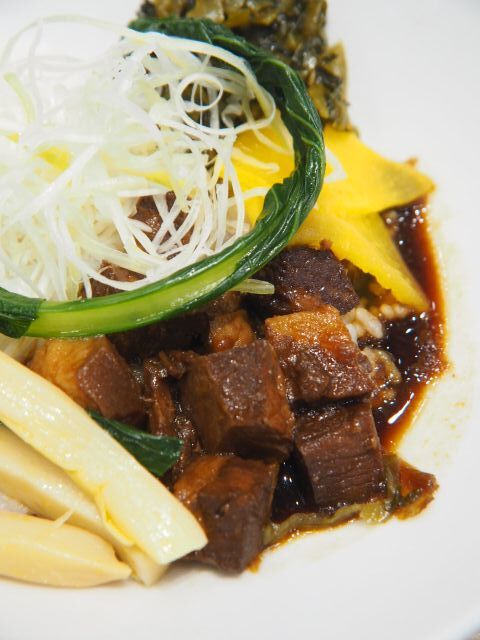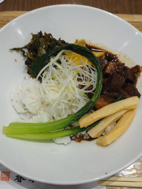 台湾では、ご飯に豚肉を乗せただけのものが一般的らしいが、同店では日本で提供するにはそれでは物足りないと感じたのかチンゲン菜、メンマ、ネギをトッピング。豪華バージョンに。