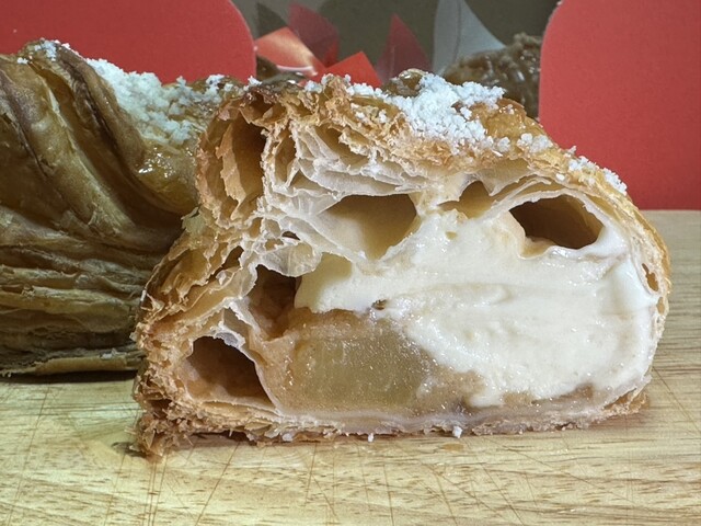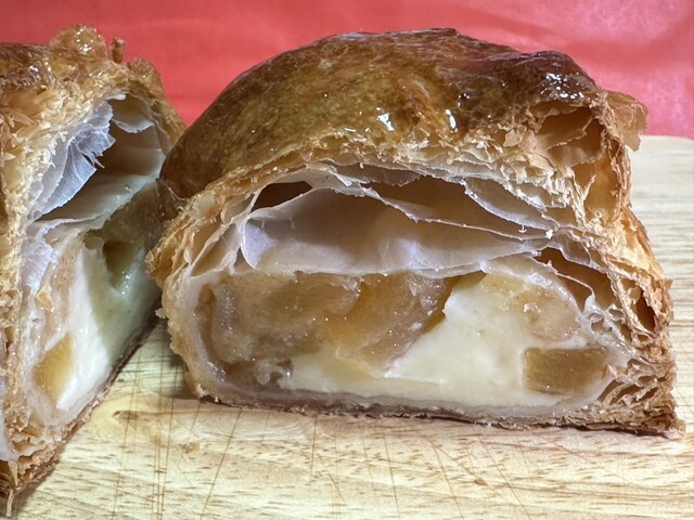 りんごの酸味をやさしく包み込むなめらかで濃厚なカスタードクリームがたっぷり入っているのが特徴。フレッシュバターを丁寧に練り込んだパイ生地のサクサク食感をより楽しんでいただくために、グローブ型に仕上げへ。