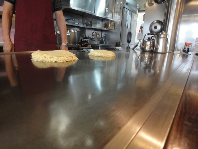 実際の調理では、厨房から見て左側の鉄板は「保温用」、右側は「調理用」と使い分けているそうです。