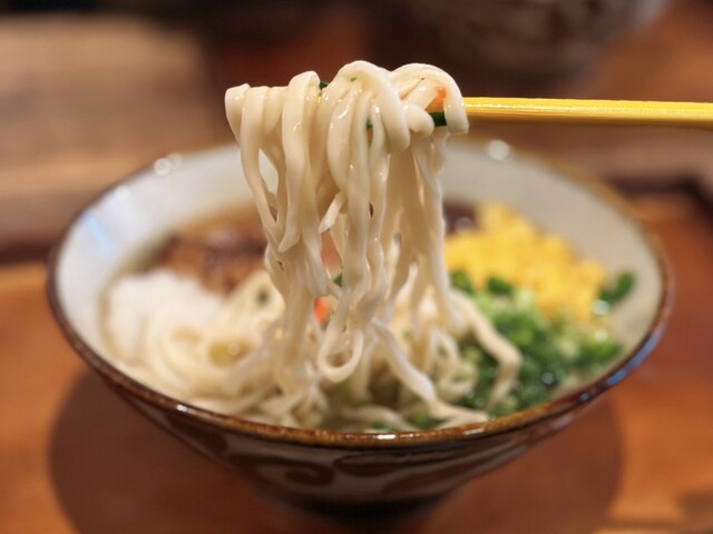 到着した器にはメインの軟骨ソーキに白色のかまぼこ、緑色の刻みネギ、黄色の錦糸たまご、紅生姜が乗る彩り豊かな具材ラ...