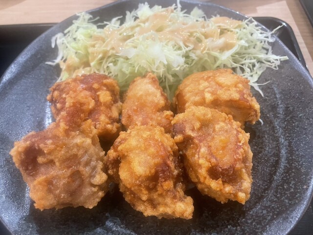 九州醤油唐揚げ定食…ふつうサイズの唐揚げが6個、味噌汁にごはんの組み合わせでコスパはまずまずかと感じます…...