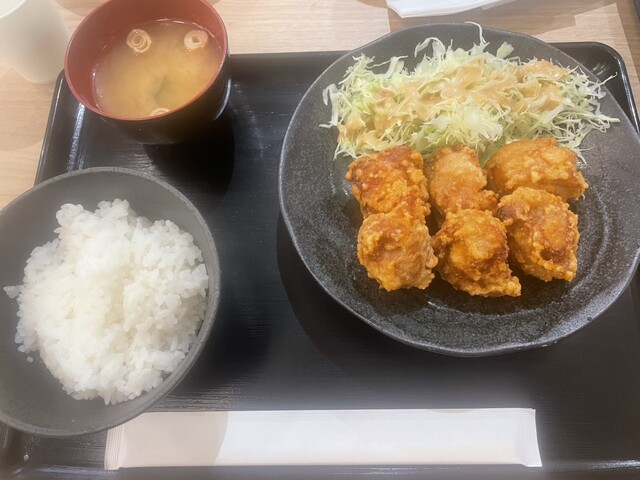 九州醤油唐揚げ定食…ふつうサイズの唐揚げが6個、味噌汁にごはんの組み合わせでコスパはまずまずかと感じます…...