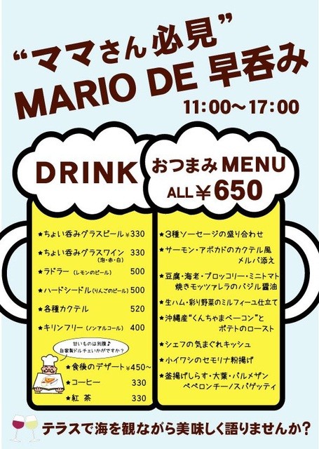 | ドリンク | 焼酎あり、ワインあり、カクテルあり、ワインにこだわる、カクテルにこだわる |