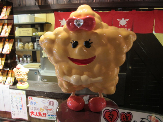 厳島神社より徒歩8分 表参道商店街の真ん中あたり『揚げもみじ』の赤いのぼりと揚げもみじイメージキャラクター 『平のあげもみ公』 が目印しです。