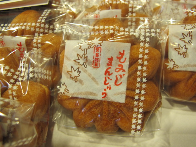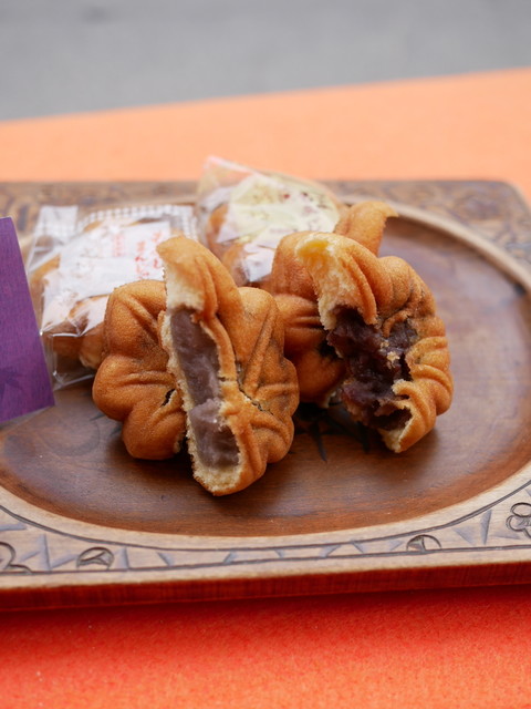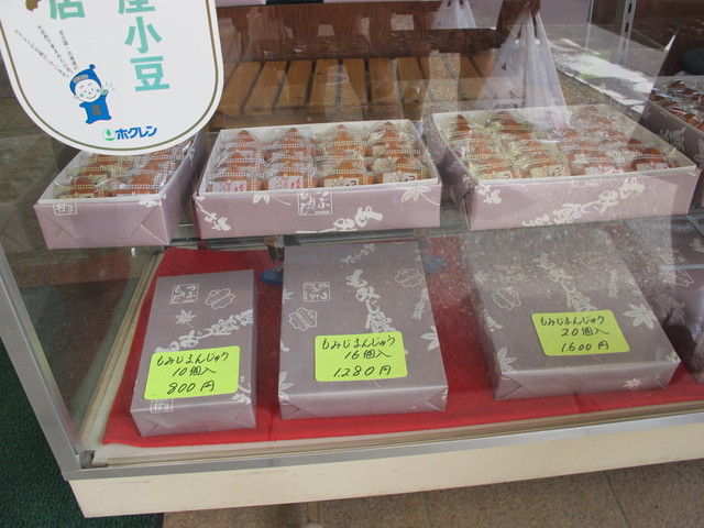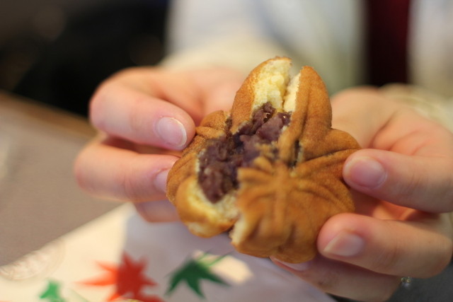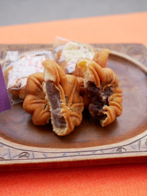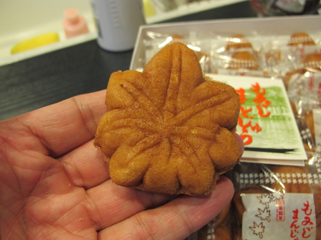 お店でもみじ饅頭を買い、お店の向かい側にベンチが3つあり、そこで座って食べられます。