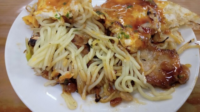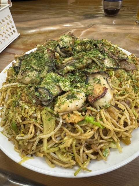 ・ミネラルを感じる牡蠣の味わいからネギ、豚肉、焼きそばの味が口の中を覆います。