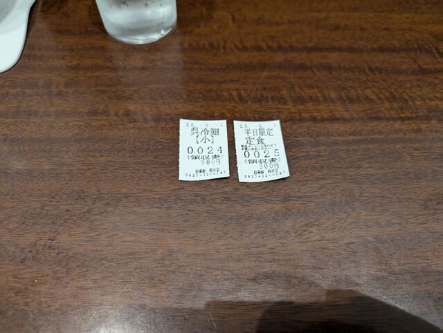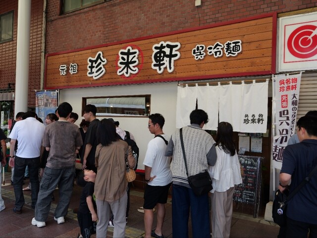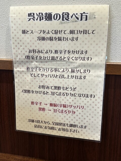 呉冷麺の発祥店である珍来軒は何度か足を運んだことがあるもののお昼に利用するのははじめてでした。店前には10名くらいの客が並んでおり、15分くらい待ってから呉冷麺大盛りの食券を購入し、席に着きました。