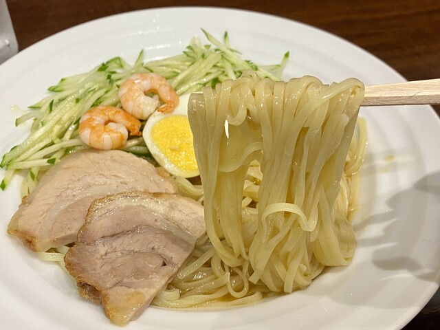土曜日13時30分、前に一組待ち。人気店にしては空いていた。先にチケットを買うように指示されたので、着席後はすぐに着冷麺。平打ち麺はつゆがよく絡み、適度な辛さのつゆか食欲を増殖させる。途中黒酢を足すと...