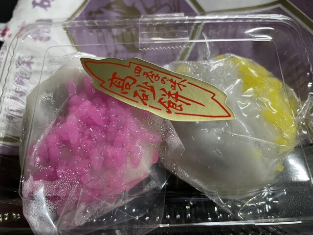 いが餅ってなにか店のお姉さんに聞くと、餡ころ餅の上にもち米をのせてあるそうです。ピンク、緑、黄とありますが、色を付けてあるだけでほとんど一緒だそうです。
