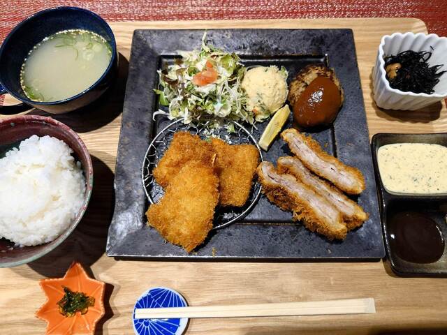 今日の和定食は運の良い事に,初めてこのメニューが在って頼んでみました。小鉢・冷奴・生野菜とポテトサラダの盛り合わせ・ワカメと豆腐の味噌汁・ご飯が付いてます。「はさみ揚げ」はかりっと揚がっていて,餡...