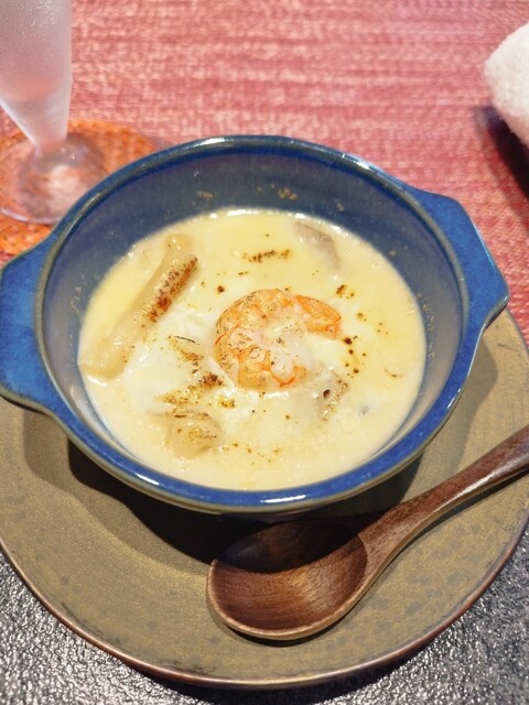 「生米」から煮込むので時間が掛かるため,数日前にリクエストして食べられる事になりました。「リゾット」には中振りの海老・烏賊・小ぶりのアサリが入っており,パセリが散らして在ります。魚介類の旨味がお米...