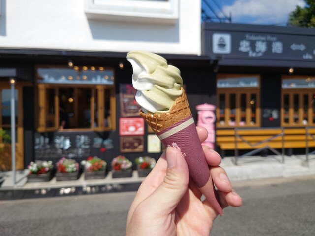 ミルクと抹茶のミックスをお願いいたします。うけとったソフトクリームのサイズは...