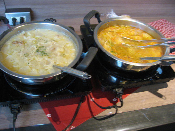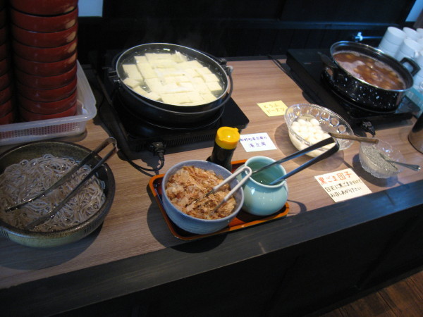 特に目を引くのは、一人鍋のブュッフェ。好みの野菜を選び、出汁(醤油、辛味噌、味噌から選べる)をよそって、豚肉もしっかりと加えます。最後に固形...