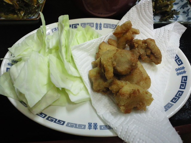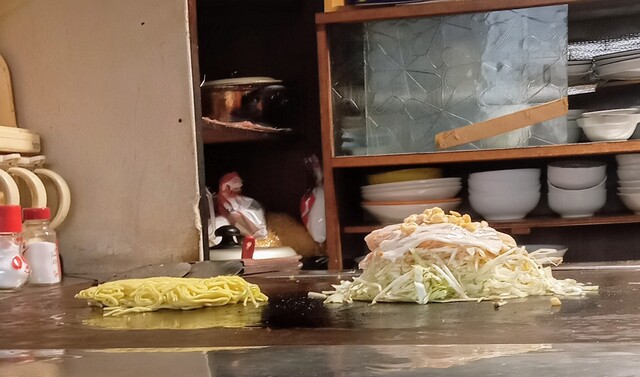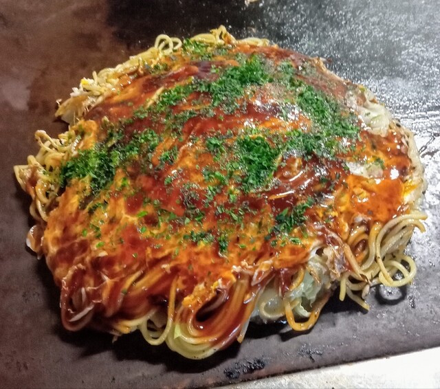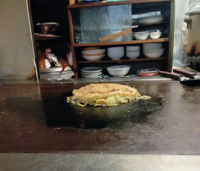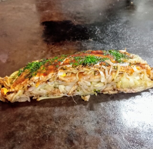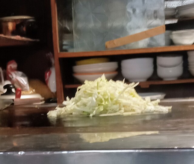 鉄板も大きいとは言えず鉄板席は2名分ですね休日のランチタイムを外した時間に寄ったので先客居らず無事鉄板前を確保です♪鉄板はいい色に焼けて店の歴史を物語ってます