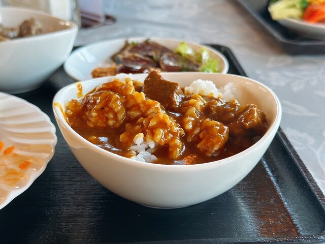 ランチはビュッフェ形式のため、早速トレーに小皿を並べて各種料理を盛っていく。どれもおいしそうで目移りするが、まずは生野菜とポテトサラダをボウルに盛ると、続いては牛すじ煮込みを他のボウルに単独で盛る。小皿にはカツオのたたき風サラダとメンチカツ、メインの平皿には...