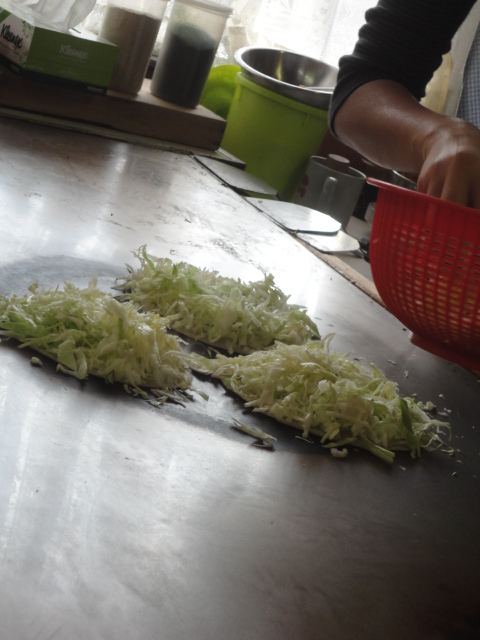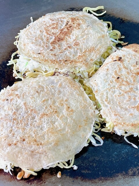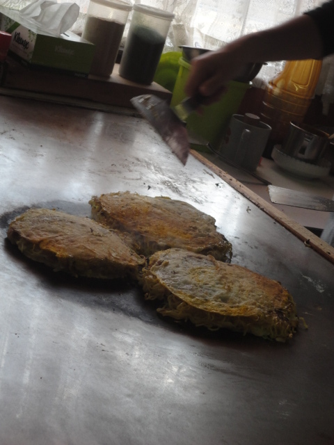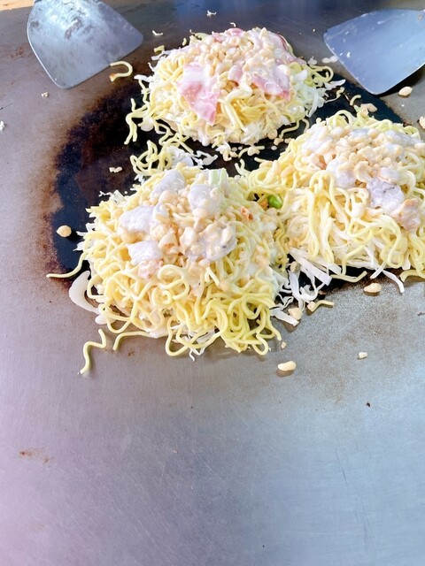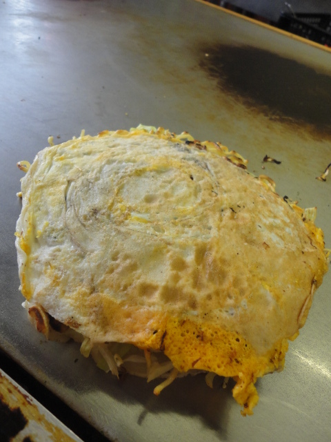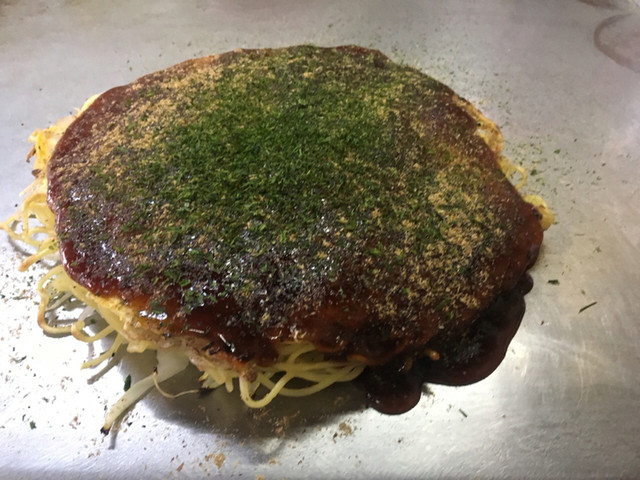 大きな鉄板で焼いてくれる広島焼きを