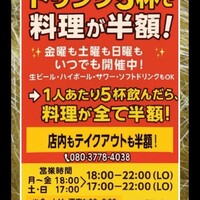 お一人あたりドリンク5杯以上ご注文で、料理メニューが全品 半額に。 このサービスは電話予約いただいたお客様限定 となります。 こちらのサイト経由でのご予約は 対象外 となりますのでご注意ください。 ご利用の際は、必ずお電話でご予約ください。 当日予約OK。 受付080-3778-4038 百勝伝