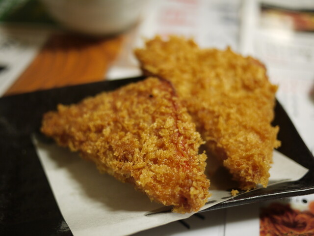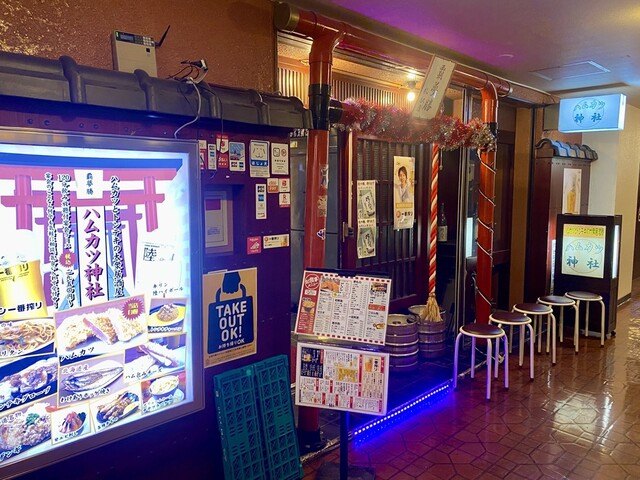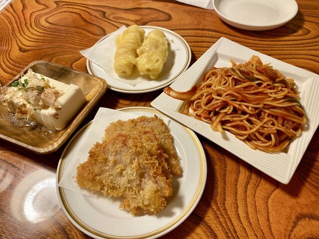 友人誘って久々のハムカツ神社へ.•♬ 頼むのもはだいたいいつも決まってる。ナポリタン(99円)を注文。大根とかつお節のサラダ(99円)と、おまかせ串盛り6本(990円)、もつ煮込... 詳細を見る