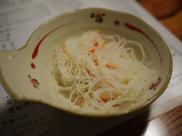 頼むのもはだいたいいつも決まってる。ナポリタン(99円)を注文。大根とかつお節のサラダ(99円)と、おまかせ串盛り6本(990円)、もつ煮込み(550円)を追加で注文しました♪