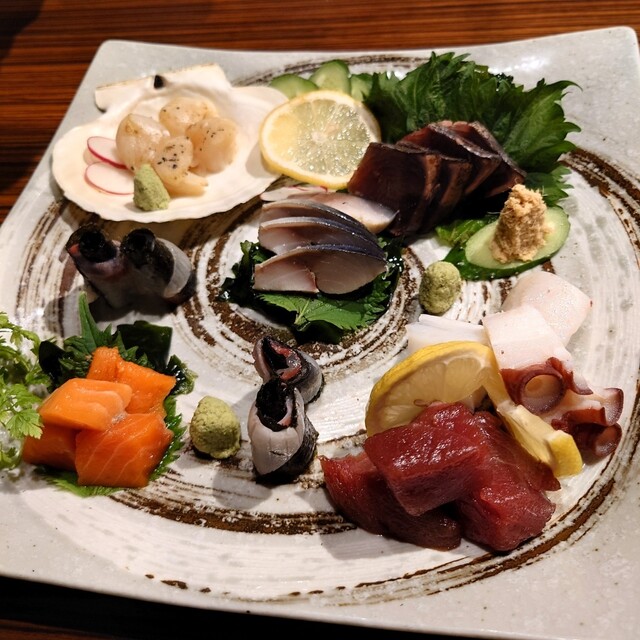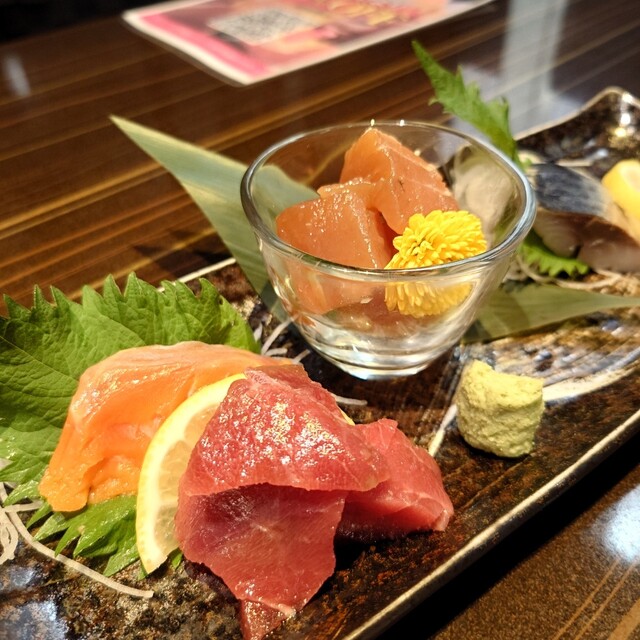 「お刺身ちょこっと盛り5種」・・本鮪はとろっとしたいいところが提供されます。帆立・サーモン・〆さばなどどれも新鮮で美味しい!