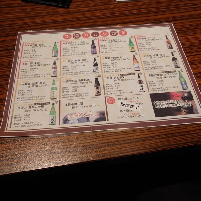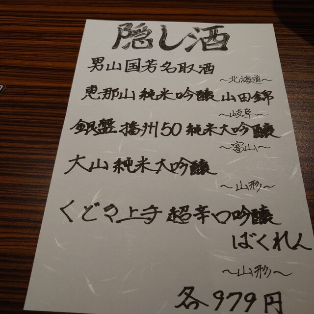 飲み物はビールに続いて日本酒を。地酒は種類が多いですね。隠し酒もある!