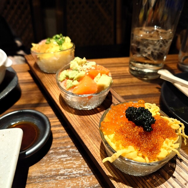 「リッチな卵焼き」は、厚焼き卵に「いくら」がたっぷり!「とろたくタワー」は、たくあんが入ったねぎとろをタワーのように。海苔を巻いて頂きます。「スケルトン海鮮ちらしは」、小ぶりの器に3種の海鮮ちらし。旨いだけでは無く、提供の仕方が工夫されているよね。いいと思います!!