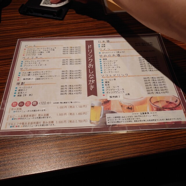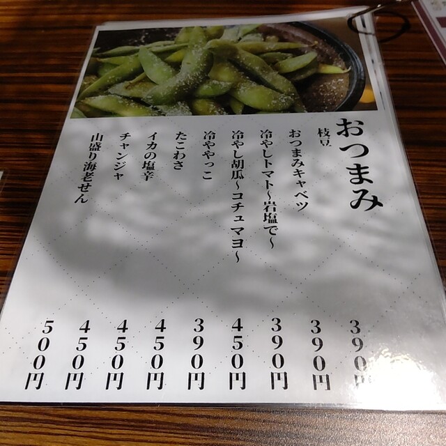 まずは、「生ビール」で乾杯!!お通しが無いので好きなものを頼みましょう。メニューは前回来た時と比べて少し変わっていたかな?