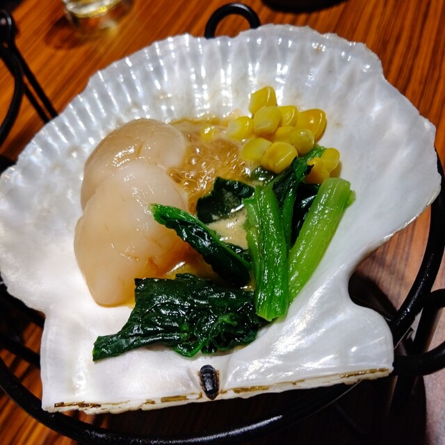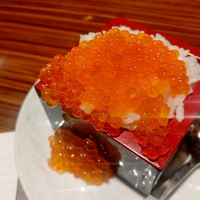 本鮪は、とろっとしたいいところが提供されます。冷製卵焼きには、たっぷりのこぼれいくらとじゃこ、サーモンも添えて頂きましょう。贅沢な一品。見た目に映えるだけでは無く、旨いです!炙ったホタテ貝は、バター醤油の味わいが香ばしいですね。