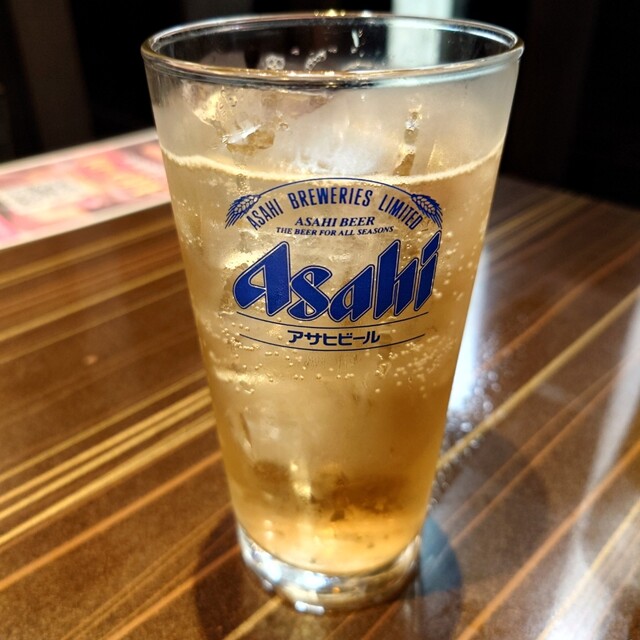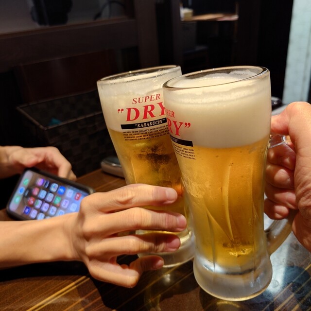 飲み物、僕は「アサヒスーパードライ中ジョッキ」で。乾杯!!