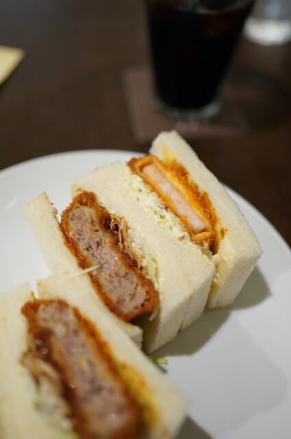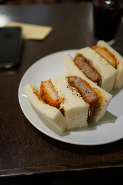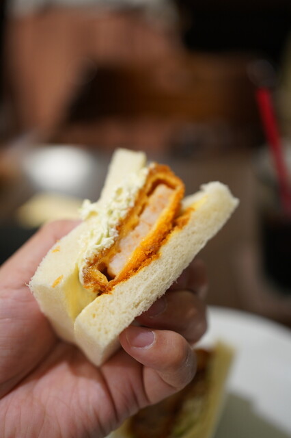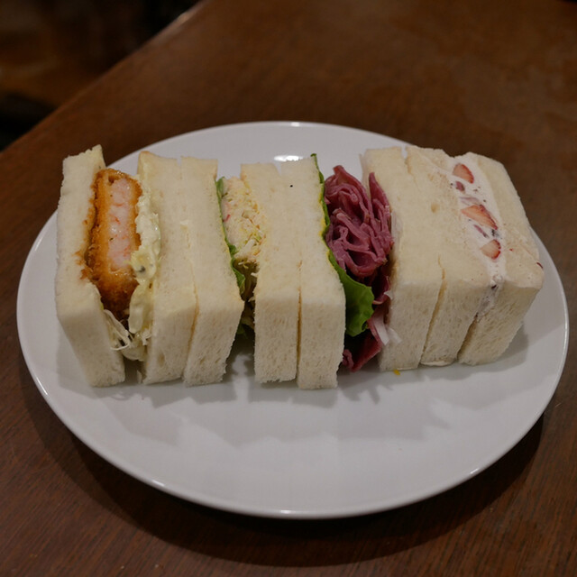 ほどなく提供されたサンドは、断面の美しさが印象的。たまごサンドは胡瓜の食感が心地よく、白身をやや大きめに残した...