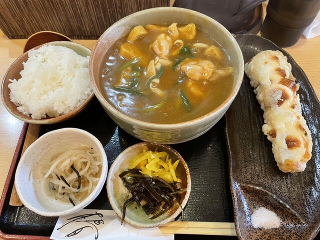 前回海老天カレーうどんを食べたので、今日はシンプルに鶏カレーうどん900+定食150にしました。定食はご飯+小鉢+漬物がつきます。他の方はやはり限定のちく天カレーうどんが人気ですねー