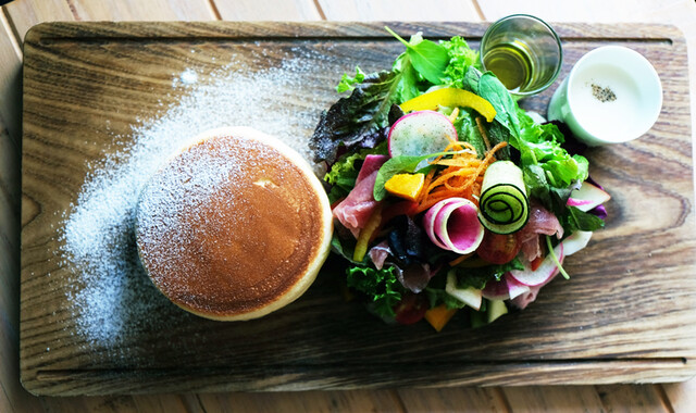 ふわとろの食感と、可愛らしい見た目に夢中になる人が後を絶たない人気店。季節によってフルーツや食材を組み合わせた、リコッタチーズ入りのぱんけーきは分厚く2枚提供されますが、ぺろりと食べられてしまう軽さです。