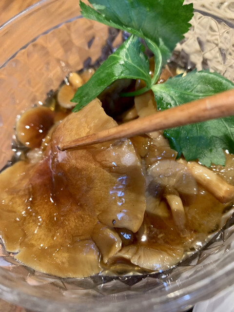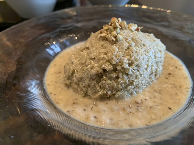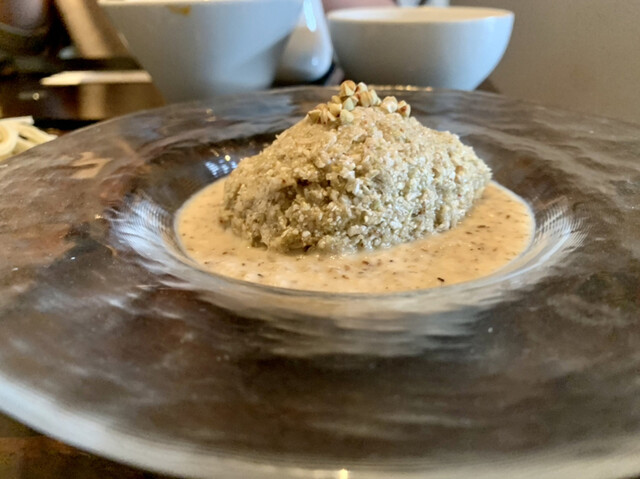 更に面白いのは④で、なんと!福井在来種に、常温開口状態で1年間寝かせた「ひね蕎麦」(熟成とは異なり単純に古くなった蕎麦)を敢えてブレンドさせている事。理屈は解らないが何らかの化学反応があるようで、いきなり…と言うよりは噛み締めて蕎麦の味香がじんわりと深い音色で梵鐘のようにフィードバックしてくるような、私が最も好きなタイプの味香表現のある粗挽き系の蕎麦だった。この発想はコロンブスの卵的で斬新だ。