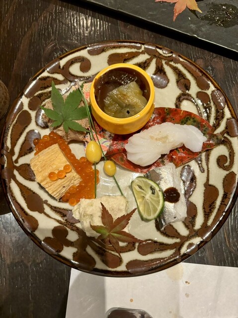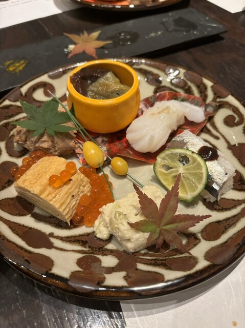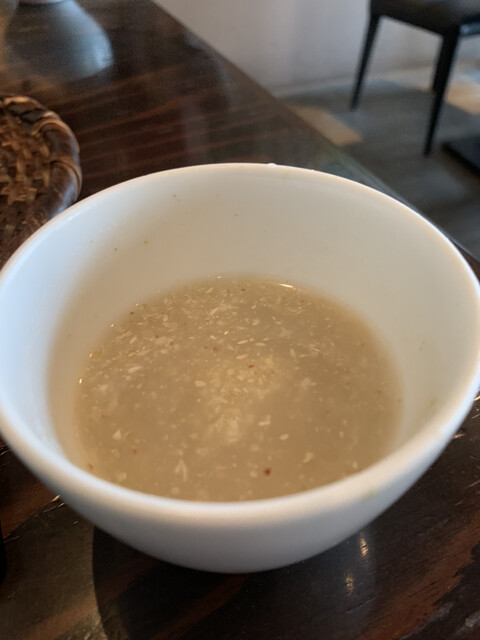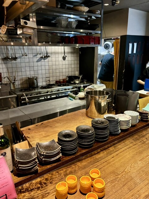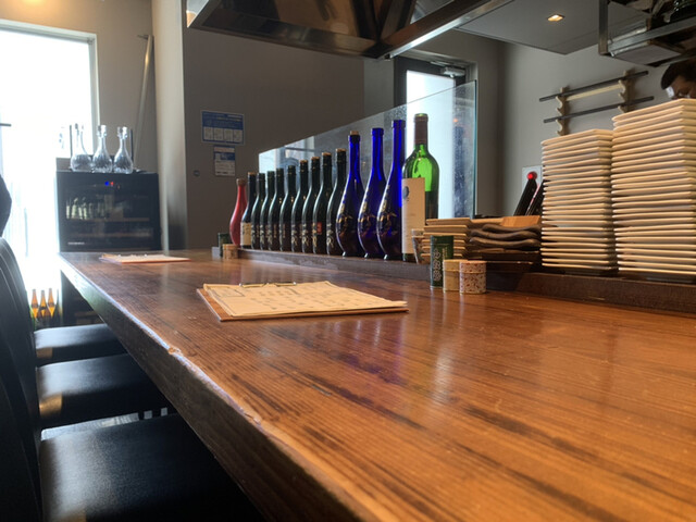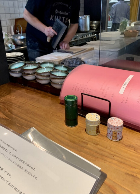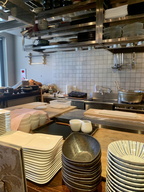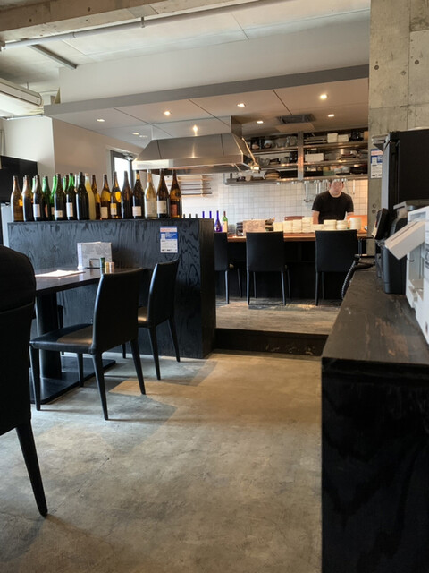 GoToEatでランチ予約して訪問。店内はシックで落ち着いた感じ。広々としたカウンターと清潔なオープンキッチンが目を惹く。その奥にはテーブル席があり、個室も備えるので様々なシチュエーションに対応する。