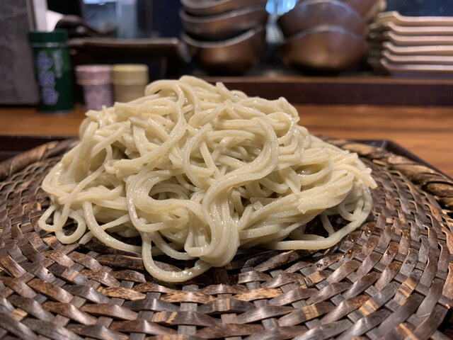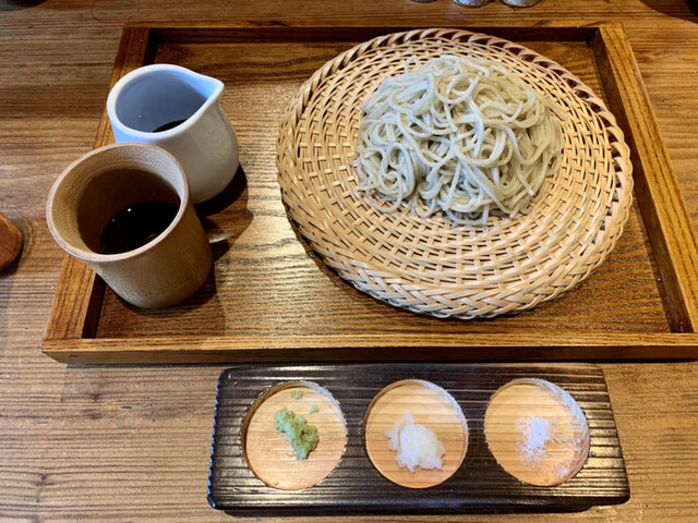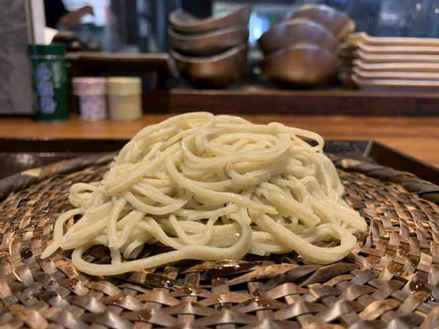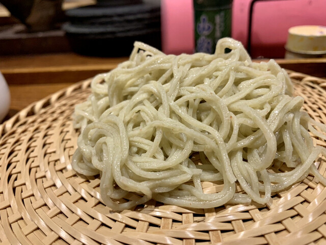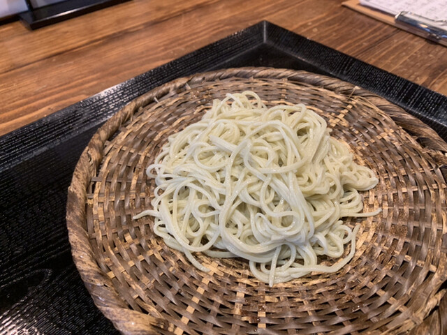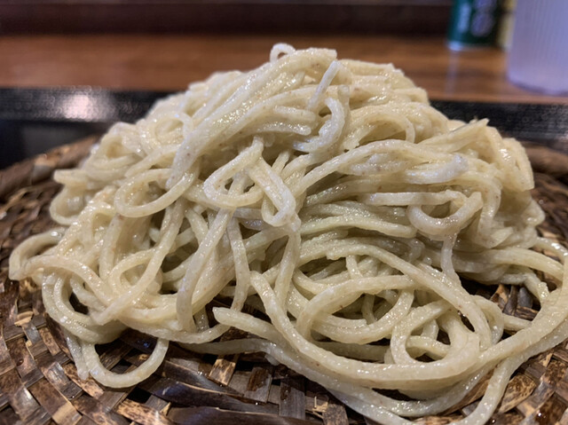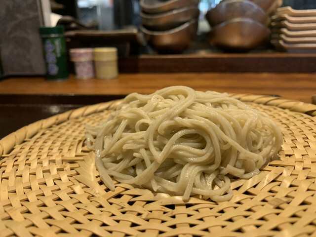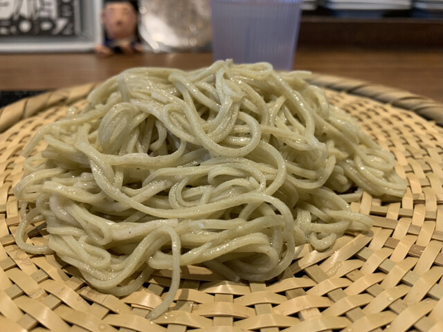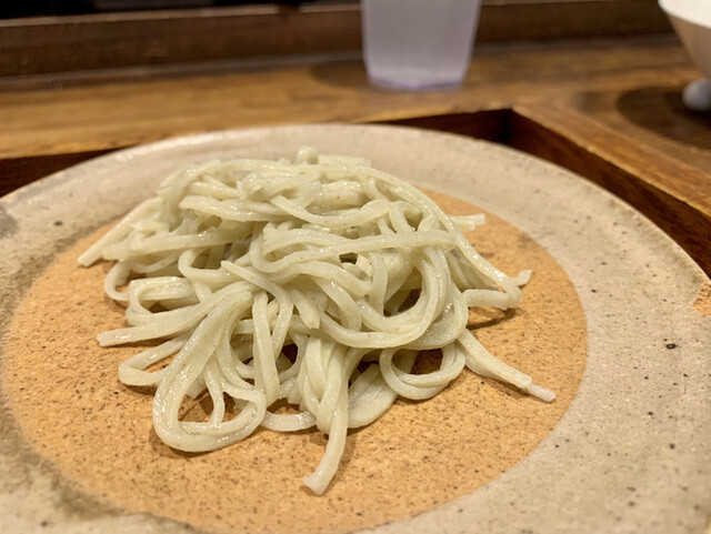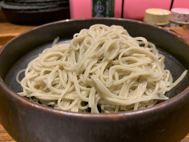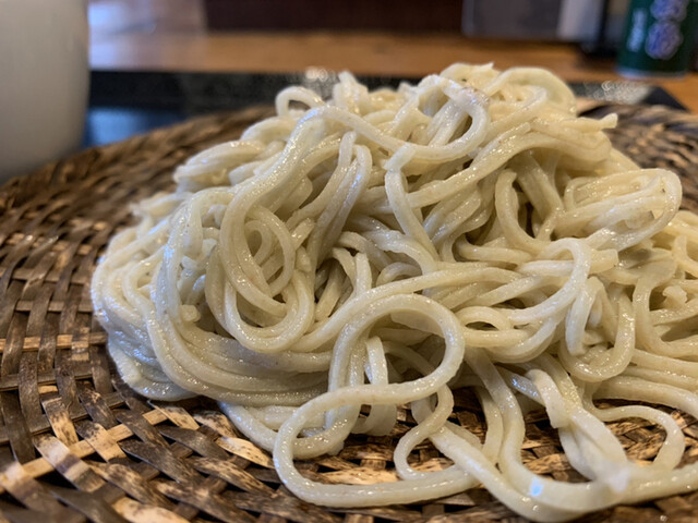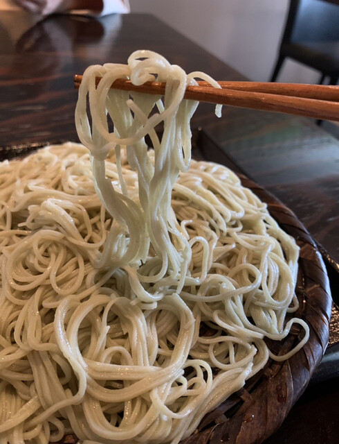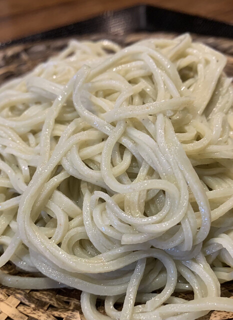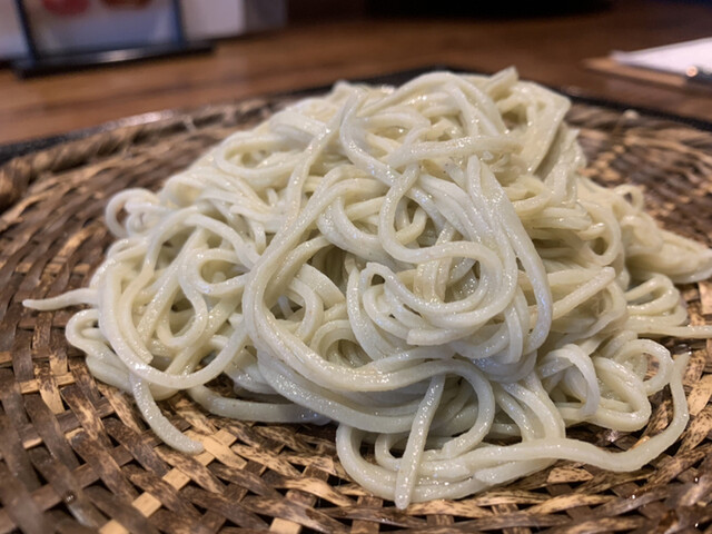 ほんのり緑掛かった色にテンションアップ。例えるなら繊細な女性的、やや細めでしなやかな麵線はしっとりとしながらもきちんとコシも入る。ズズッと手繰れば青々しい風味が抜け、後味には蕎麦本来の甘味が追う…これは旨い。