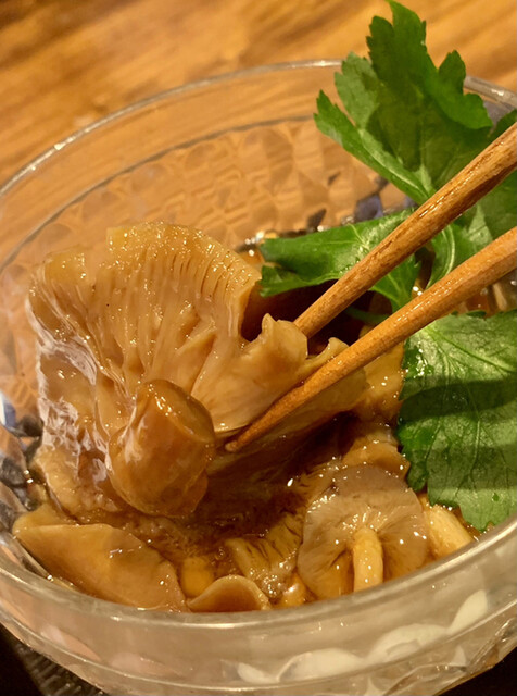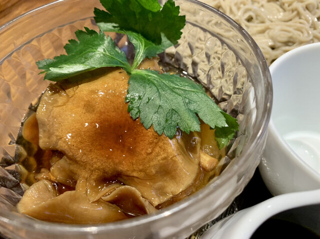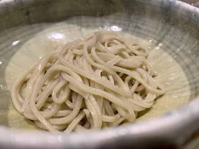私同様、筋金入りのマニアがここにも居たのだ。聞けば蕎麦粉は都度(2週おき程度)変えるスタイルをとり、自宅に備えた石臼で夜な夜な実を挽くという。そして汁には3度カビ付けした鹿児島産枯れ節や自身が納得する鯖節などを厳選して使用、醤油もこだわりのものを使用し、蕎麦を上回らないように半生返し(砂糖やみりんと煮立てた醤油と生醤油をブレンドして寝かす)で穏やかさがありつつ、しっかりとした主張を演出したいとの事。