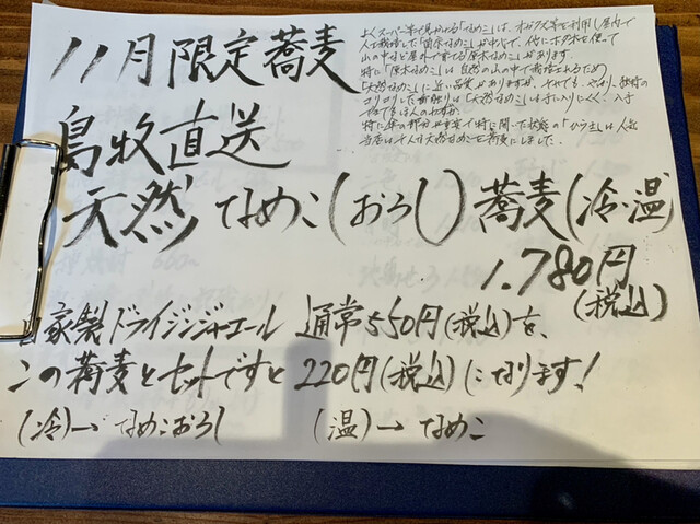余談となるが、私は某SNSでは顔写真や本名を公開しており、そちらの蕎麦コミュニティにこちらのご主人も参加している経緯他から、今回流れ星としての訪問に気が付いたようで、丁寧にご挨拶を頂いた。そして丁度お客が引けたタイミングだったので、色々とお話をさせて頂いたのだが…