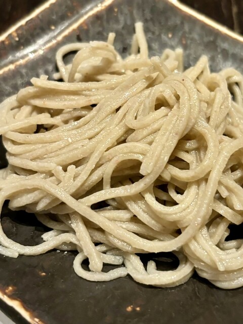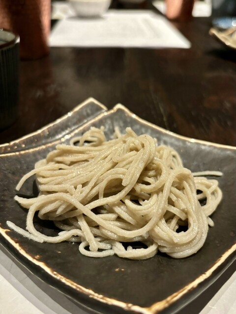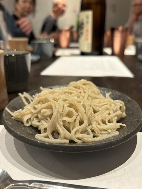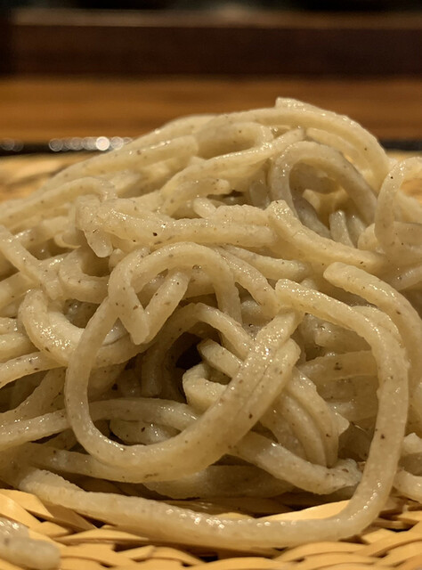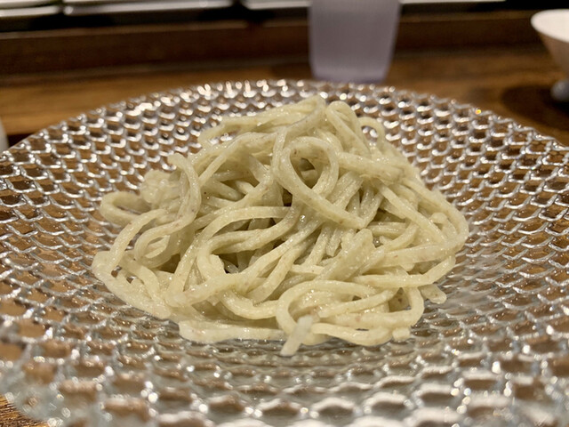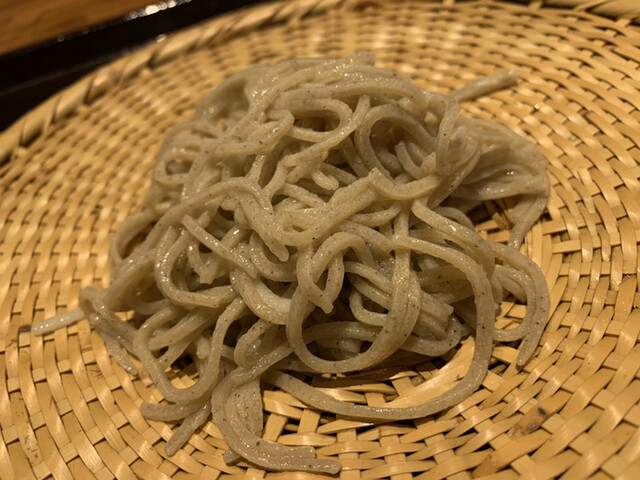 その場で打ちたての提供。香り良く、手繰れば蕎麦の甘みと清涼感の余韻がジワリジワリ。黒田氏の蕎麦はそのガタイの大きさとは裏腹に、滑らかで優しく繊細な麺線が良い意味で個性と感じているが、今回は力強さを演出してきた。やはりその粉に応じて表現したい世界観があったのだろう。
