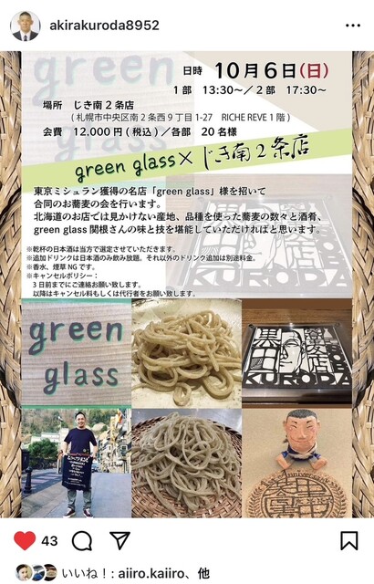 日曜日は、私も通う「じき南2条店」にて開催された蕎麦会の夜の部に、食べログレビュアーの星月夜さんと参加。東京のミシュラン蕎麦店「green glass」の関根さんを交えてのコラボイベントだ。