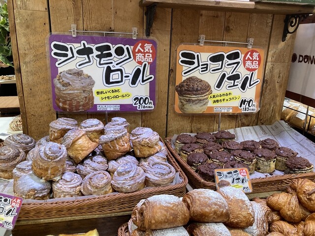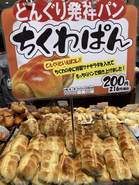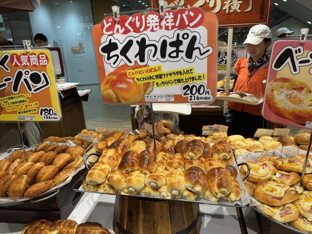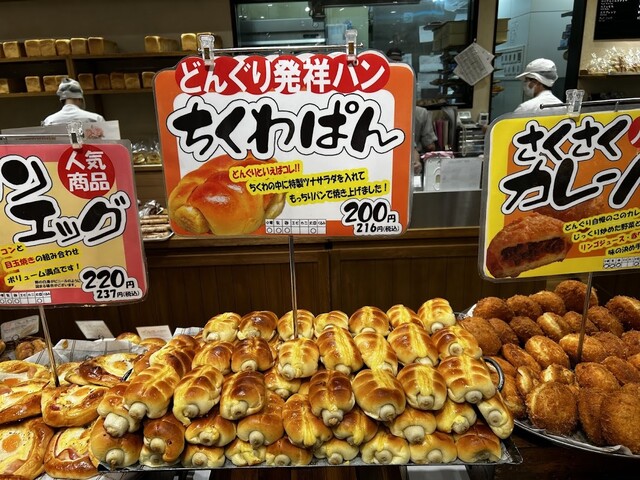 「ちくわパン」や「ベーコンエッグ」などが人気! 定番のパンをはじめ、シンプルな食事パンから、季節の素材を活かした調理パンなどが楽しめます。手作りスウィーツも人気です。焼き立てパンやスウィーツ、手作り惣菜が所せましと並ぶ店内はワクワク感の宝庫! カフェスペースも36席あり、ランチタイムやショッピングの後に、パンやスウィーツをドリンクと一緒にどうぞ。